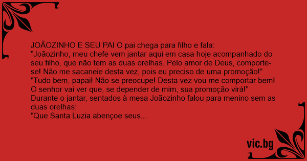 "Joãozinho, meu chefe vem jantar aqui em casa hoje acompanhado do seu filho, que não tem as duas orelhas. Pelo amor de Deus, comporte-se! Não me sacaneie desta vez, pois eu preciso de uma promoção!"