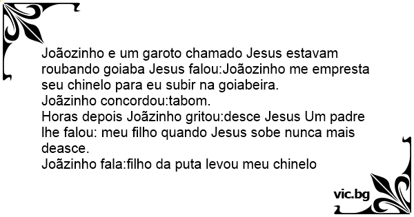 Joãozinho e um garoto chamado Jesus estavam roubando goiaba Jesus falou:Joãozinho me empresta seu chinelo para eu subir na goiabeira.