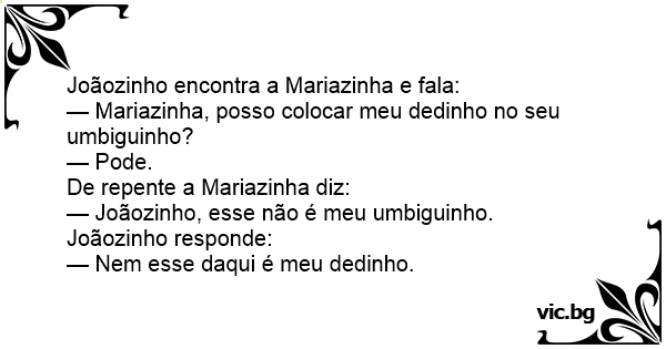 Joaozinho perguntou para a sua amiga: — Mariazinha, eu posso por a mão no seu umbiguinho? E recebeu a resposta: — Pode. Passado um tempo... Mariazinha retruca: — Mas... Joaozinho, ai não é o meu...