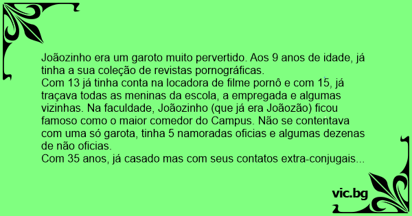 Com 13 já tinha conta na locadora de filme pornô e com 15, já traçava todas as meninas da escola, a empregada e algumas vizinhas. Na faculdade, Joãozinho (que já era Joãozão) ficou famoso como o maior comedor do Campus. Não se contentava com uma só garota, tinha 5 namoradas oficias e algumas dezenas de não oficias.