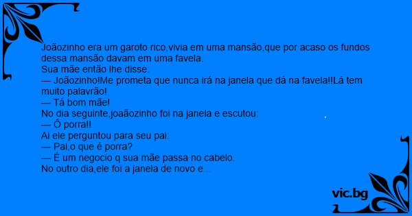 — Joãozinho!Me prometa que nunca irá na janela que dá na favela!!Lá tem muito palavrão!