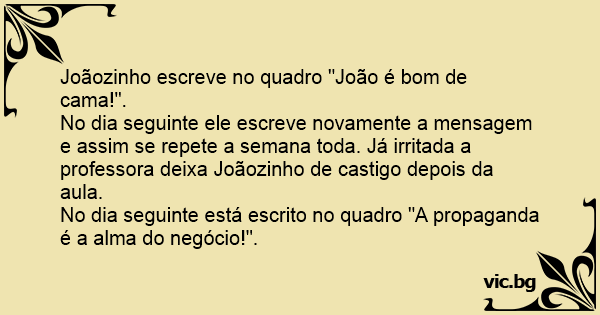 No dia seguinte ele escreve novamente a mensagem e assim se repete a semana toda. Já irritada a professora deixa Joãozinho de castigo depois da aula.