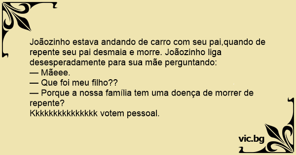 Joãozinho estava andando de carro com seu pai,quando de repente seu pai desmaia e morre. Joãozinho liga desesperadamente para sua mãe perguntando: