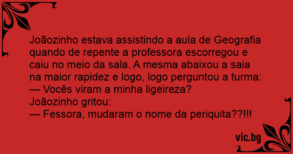 Joãozinho estava assistindo a aula de Geografia quando de repente a professora escorregou e caiu no meio da sala. A mesma abaixou a saia na maior rapidez e logo, logo perguntou a turma: