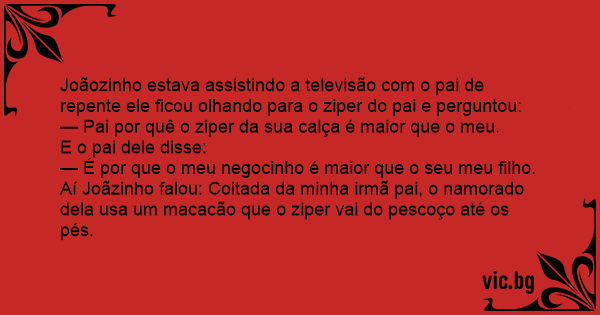 Joãozinho estava assistindo a televisão com o pai de repente ele ficou olhando para o ziper do pai e perguntou: