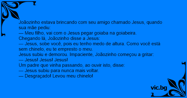 Joãozinho estava brincando com seu amigo chamado Jesus, quando sua mãe pediu: