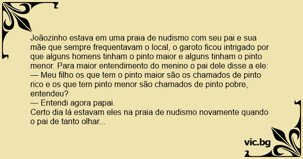 Joãozinho estava em uma praia de nudismo com seu pai e sua mãe que sempre frequentavam o local, o garoto ficou intrigado por que alguns homens tinham o pinto maior e alguns tinham o pinto menor. Para maior entendimento do menino o pai dele disse a ele: