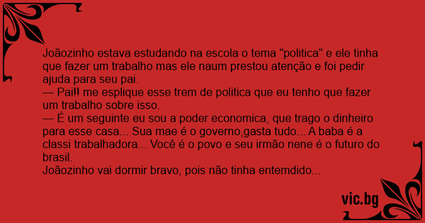 Um dia o filho do cara perguntou para ele pai o que é política, política deixa eu ver como eu te explico. É assim eu sou o capitalista o presidente que ganha dinheiro a sua mãe é a governanta a que...