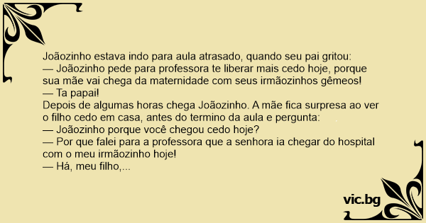 — Joãozinho pede para professora te liberar mais cedo hoje, porque sua mãe vai chega da maternidade com seus irmãozinhos gêmeos!