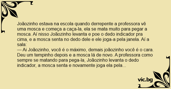 Joãozinho estava na escola quando derrepente a professora vê uma mosca e começa a caça-la, ela se mata muito para pegar a mosca. Aí nisso Joãozinho levanta e poe o dedo indicador pra cima, e a mosca senta no dedo dele e ele joga-a pela janela. Aí a sala: