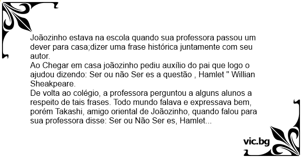 De volta ao colégio, a professora perguntou a alguns alunos a respeito de tais frases. Todo mundo falava e expressava bem, porém Takashi, amigo oriental de Joãozinho, quando falou para sua professora disse: Ser ou Não Ser es, Hamlet " Willian Sheakspeare".