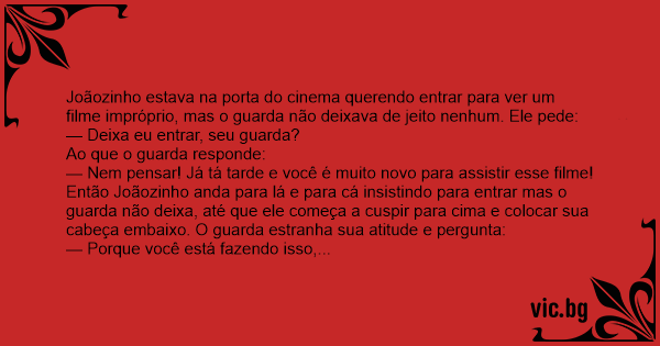 — Nem pensar! Já tá tarde e você é muito novo para assistir esse filme! Então Joãozinho anda para lá e para cá insistindo para entrar mas o guarda não deixa, até que ele começa a cuspir para cima e colocar sua cabeça embaixo. O guarda estranha sua atitude e pergunta: