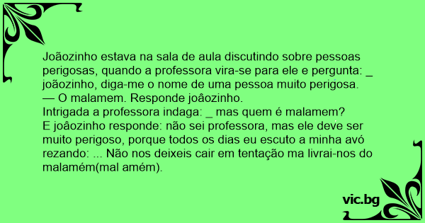 E joâozinho responde: não sei professora, mas ele deve ser muito perigoso, porque todos os dias eu escuto a minha avó rezando: ... Não nos deixeis cair em tentação ma livrai-nos do malamém(mal amém).