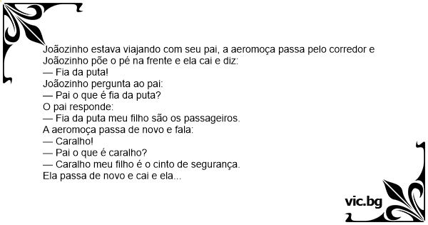 Joãozinho estava viajando com seu pai, a aeromoça passa pelo corredor e Joãozinho põe o pé na frente e ela cai e diz: