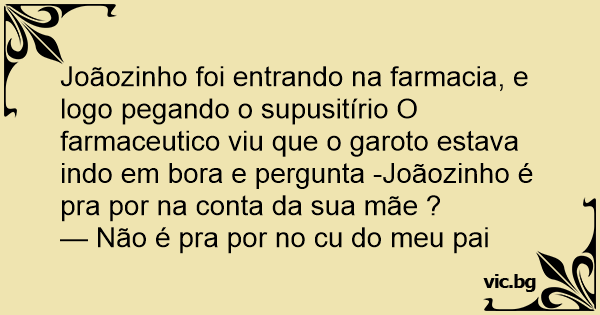 Joãozinho foi entrando na farmacia, e logo pegando o supusitírio O farmaceutico viu que o garoto estava indo em bora e pergunta -Joãozinho é pra por na conta da sua mãe ?