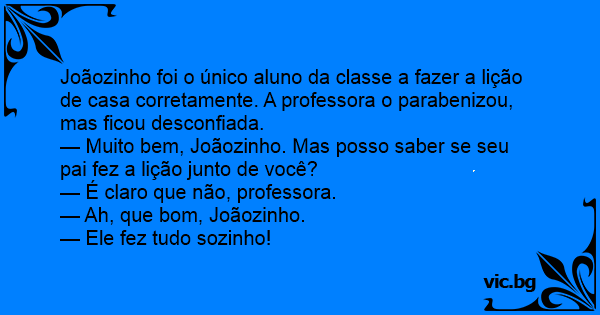 Joãozinho foi o único aluno da classe a fazer a lição de casa corretamente. A professora o parabenizou, mas ficou desconfiada.