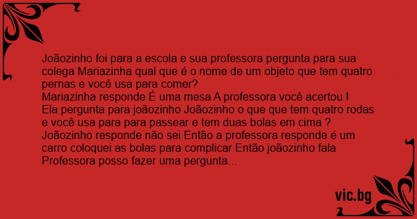 Joãozinho responde não sei Então a professora responde é um carro coloquei as bolas para complicar Então joãozinho fala Professora posso fazer uma pergunta para você A Professora responde, Pode Então joãozinho pergunta O que as mulheres gostam de por na boca tem a cabeça vermelha e te duas bolas ?