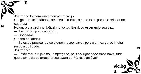 — Então meu Sr. já estou empregado, pois no lugar onde trabalhava, tudo que acontecia de errado procuravam eu, "O responsável".