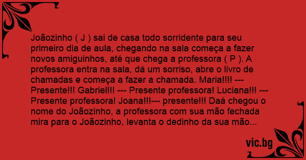 Joãozinho ( J ) sai de casa todo sorridente para seu primeiro dia de aula, chegando na sala começa a fazer novos amiguinhos, até que chega a professora ( P ). A professora entra na sala, dá um sorriso, abre o livro de chamadas e começa a fazer a chamada. Maria!!!! --- Presente!!! Gabriel!!! --- Presente professora! Luciana!!! --- Presente professora! Joana!!!--- presente!!! Daá chegou o nome do Joãozinho, a professora com sua mão fechada mira para o Joãozinho, levanta o dedinho da sua mão esquerda e delicadamente mexe o dedinho para frente e para trás, dizendo: ( P ) Bom dia Joãozinho!!!! Joãozinho assustado responde: ( J ) Bom dia Professora. Essa cena se repetiu por mais três dias, Joãozinho indignado vira-se para o lado e fala com seu amigo: ( J ) Que cac*te está acontecendo???, toda vez que essa professora vai falar meu nome ela levanta o dedinho e fala meu nome???? ( J ) Deixa que amanhã ela vai ver só. No outro dia, Joãozinho chega na escola, senta-se na carteira e aguarda a professora fazer a chamada, até que ela para fecha sua mão mira para o Joaõzinho, levanta o dedinho da sua mão esquerda e delicadamente mexe o dedinho para frente e para trás, dizendo: ( P ) Bom dia Joãozinho!!! Joãozinho indignado, abre a boca, com os dois dedinhos abre mais ainda sua boca. E com sua boca arreganhada de aberta diz: ( J ) Boooooom diiiiia Professoooora!!!!