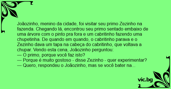 Joãozinho, menino da cidade, foi visitar seu primo Zezinho na fazenda. Chegando lá, encontrou seu primo sentado embaixo de uma árvore com o pinto pra fora e um cabritinho fazendo uma chupetinha. De quando em quando, o cabritinho parava e o Zezinho dava um tapa na cabeça do cabritinho, que voltava a сhuраr. Vendo esta cena, Joãozinho perguntou: