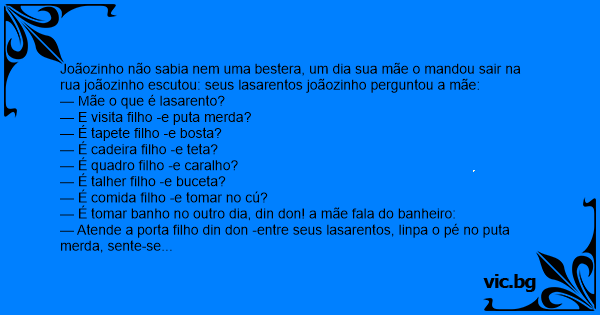 Joãozinho não sabia nem uma bestera, um dia sua mãe o mandou sair na rua joãozinho escutou: seus lasarentos joãozinho perguntou a mãe: