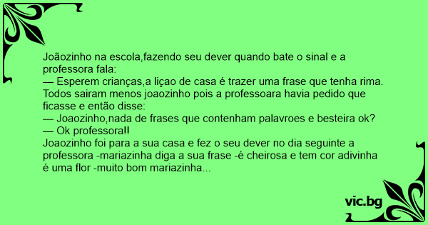 Joãozinho na escola,fazendo seu dever quando bate o sinal e a professora fala: