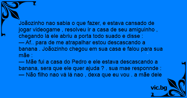 Joãozinho nao sabia o que fazer, e estava cansado de jogar videogame , resolveu ir a casa de seu amiguinho , chegando lá ele abriu a porta todo suado e disse :
