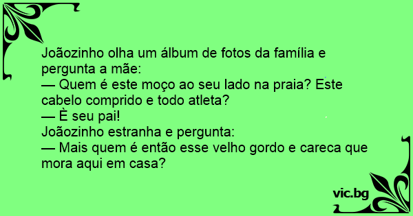 Joãozinho estava folheando um antigo álbum de família, quando viu uma foto e foi correndo perguntar para a mãe: — Mãe, quem é esse homem bonitão ao seu lado? A mãe respondeu: — É seu pai. E...