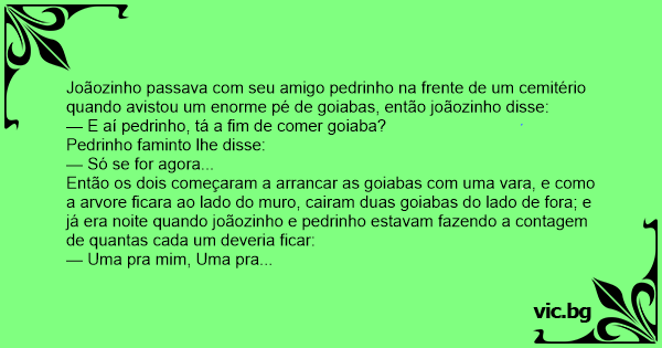 Joãozinho passava com seu amigo pedrinho na frente de um cemitério quando avistou um enorme pé de goiabas, então joãozinho disse: