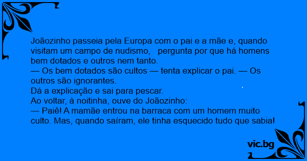 Joãozinho passeia pela Europa com o pai e a mãe e, quando visitam um campo de nudismo, pergunta por que há homens bem dotados e outros nem tanto.