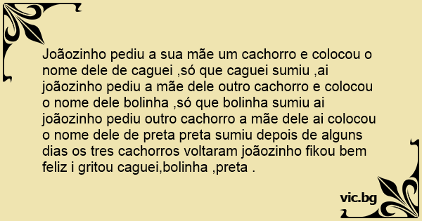 Joãozinho pediu a sua mãe um сасhоrrо e colocou o nome dele de caguei ,só que caguei sumiu ,ai joãozinho pediu a mãe dele outro сасhоrrо e colocou o nome dele bolinha ,só que bolinha sumiu ai joãozinho pediu outro сасhоrrо a mãe dele ai colocou o nome dele de preta preta sumiu depois de alguns dias os tres cachorros voltaram joãozinho fikou bem feliz i gritou caguei,bolinha ,preta .