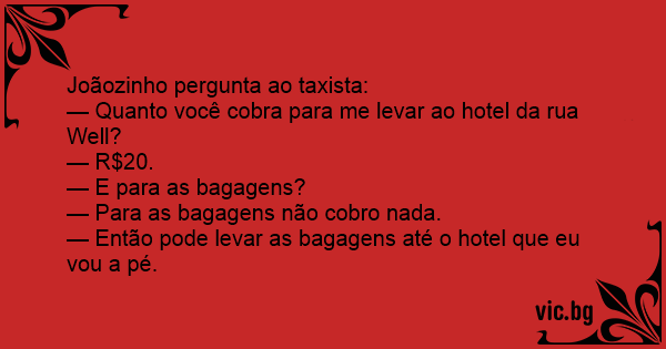 Na rodoviária o passageiro pergunta ao motorista de táxi: — Quanto custa a corrida até o hotel Mundo Novo? — São 50 reais. — E a bagagem? — A bagagem eu levo de graça. — Então leva as malas, que eu...