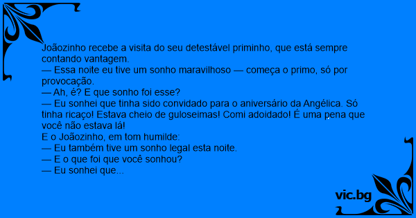 — Essa noite eu tive um sonho maravilhoso — começa o primo, só por provocação.