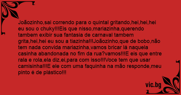 Joãozinho,sai correndo para o quintal gritando,hei,hei,hei eu sou o chuky!!!Eis que nisso,mariazinha,querendo tambem exibir sua fantasia de carnaval tambem grita,hei,hei eu sou a tiazinha!!!Joãozinho,que de bobo,não tem nada convida mariazinha,vamos bricar lá naquela casinha abandonada no fim da rua?vamos!!!E eis que entre rala e rola,ela diz,ei,para com isso!!!Voce tem que usar camisinha!!!E ele com uma faquinha na mão responde,meu pinto é de plástico!!!