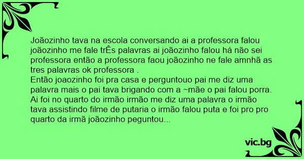 Joãozinho tava na escola conversando ai a professora falou joãozinho me fale trÊs palavras ai joãozinho falou há não sei professora então a professora faou joãozinho ne fale amnhã as tres palavras ok professora .