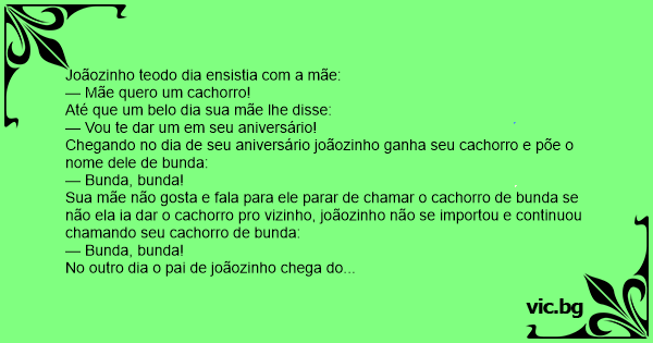 Sua mãe não gosta e fala para ele parar de chamar o сасhоrrо de bunda se não ela ia dar o сасhоrrо pro vizinho, joãozinho não se importou e continuou chamando seu сасhоrrо de bunda:
