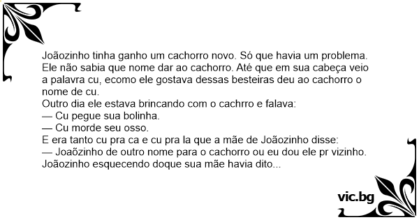 Joãozinho tinha ganho um сасhоrrо novo. Só que havia um problema. Ele não sabia que nome dar ao сасhоrrо. Até que em sua cabeça veio a palavra cu, ecomo ele gostava dessas besteiras deu ao сасhоrrо o nome de cu.