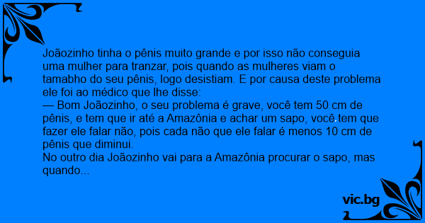 Joãozinho tinha o pênis muito grande e por isso não conseguia uma mulher para tranzar, pois quando as mulheres viam o tamabho do seu pênis, logo desistiam. E por causa deste problema ele foi ao médico que lhe disse: