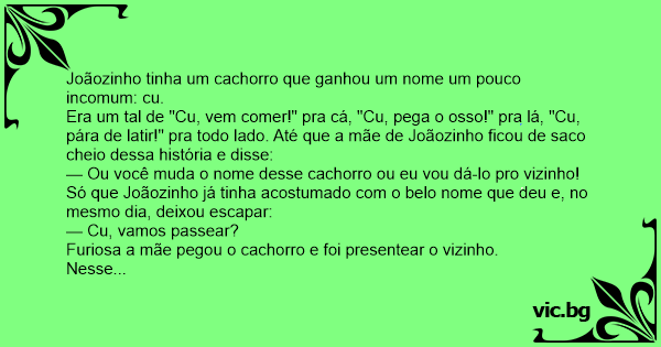 Era um tal de "Cu, vem comer!" pra cá, "Cu, pega o osso!" pra lá, "Cu, pára de latir!" pra todo lado. Até que a mãe de Joãozinho ficou de saco cheio dessa história e disse: