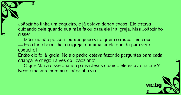 Joãozinho tinha um coqueiro, e já estava dando cocos. Ele estava cuidando dele quando sua mãe falou para ele ir a igreja. Mas Joãozinho disse:
