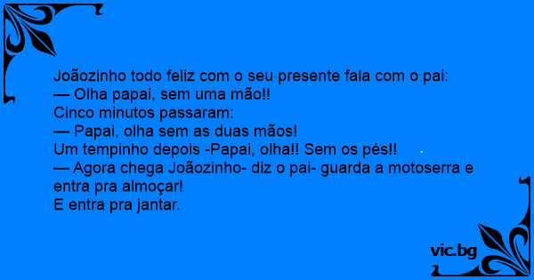 — Agora chega Joãozinho- diz o pai- guarda a motoserra e entra pra almoçar!