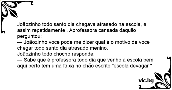 Joãozinho todo santo dia chegava atrasado na escola, e assim repetidamente . Aprofessora cansada daquilo perguntou: