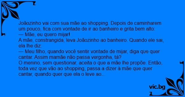 Joãozinho vai com sua mãe ao shopping. Depois de caminharem um pouco, fiса com vontade de ir ao banheiro e grita bem alto: