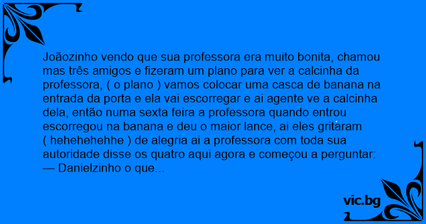 Joãozinho vendo que sua professora era muito bonita, chamou mas três amigos e fizeram um plano para ver a calcinha da professora, ( o plano ) vamos colocar uma casca de banana na entrada da porta e ela vai escorregar e ai agente ve a calcinha dela, então numa sexta feira a professora quando entrou escorregou na banana e deu o maior lance, ai eles gritaram ( hehehehehhe ) de alegria ai a professora com toda sua autoridade disse os quatro aqui agora e começou a perguntar: