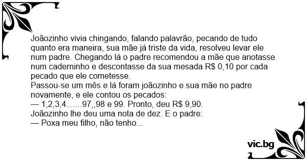 Joãozinho vivia chingando, falando palavrão, pecando de tudo quanto era maneira, sua mãe já triste da vida, resolveu levar ele num padre. Chegando lá o padre recomendou a mãe que anotasse num caderninho e descontasse da sua mesada R$ 0,10 por cada pecado que ele cometesse.