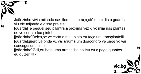 Joãozinho vivia mijando nas flores da praça,até q um dia o guarda viu ele mijando e disse pra ele: