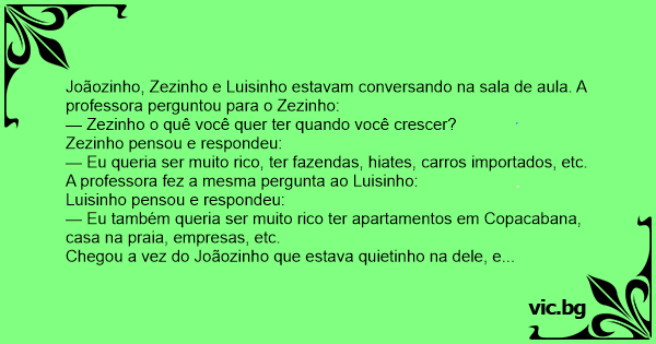 Joãozinho, Zezinho e Luisinho estavam conversando na sala de aula. A professora perguntou para o Zezinho: