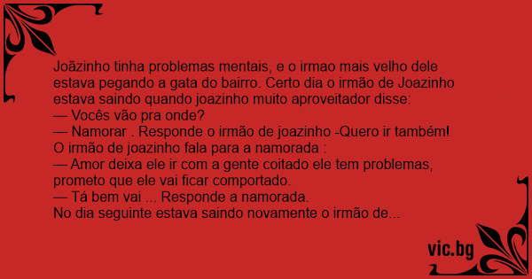 Joãzinho tinha problemas mentais, e o irmao mais velho dele estava pegando a gata do bairro. Certo dia o irmão de Joazinho estava saindo quando joazinho muito aproveitador disse: