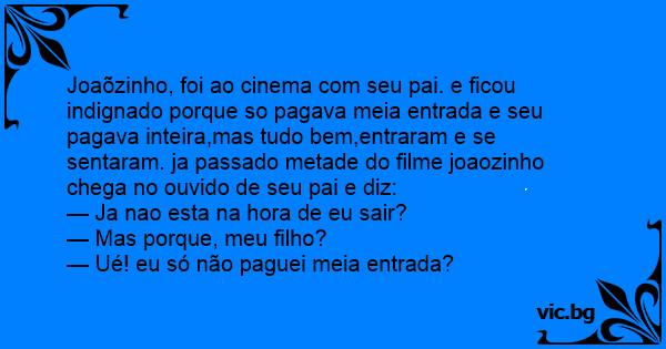 Joaõzinho, foi ao cinema com seu pai. e ficou indignado porque so pagava meia entrada e seu pagava inteira,mas tudo bem,entraram e se sentaram. ja passado metade do filme joaozinho chega no ouvido de seu pai e diz: