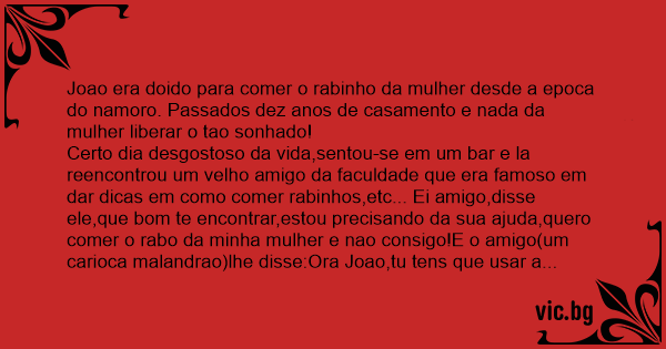 Certo dia desgostoso da vida,sentou-se em um bar e la reencontrou um velho amigo da faculdade que era famoso em dar dicas em como comer rabinhos,etc... Ei amigo,disse ele,que bom te encontrar,estou precisando da sua ajuda,quero comer o rаво da minha mulher e nao consigo!E o amigo(um carioca malandrao)lhe disse:Ora Joao,tu tens que usar a criatividade!Joao entao passou em uma loja de tintas e comprou varias latas,de varias cores. Chegou em casa,foi pro banheiro,pintou as bolas de vermelho,amarelo,e o membro de verde e rosa. Saiu do banheiro com o hobbie e abriu para a mulher. E ela vendo aquilo espantada falou:Que e isso,Joao??